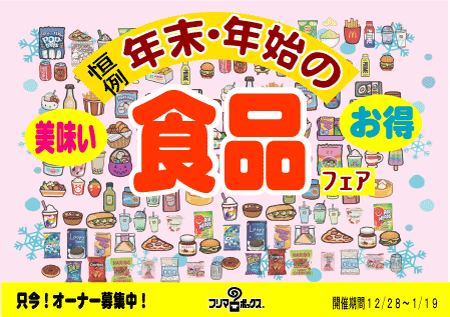 ![]() 美味しい・お得 食品フェア―1月19日まで ! ![]() 好評につき期間延長中!(1月5日まで) ![]() ![]() ![]() たいへんお得なキャンペーンになっていますので、 是非、この機会にご利用して頂きます様、 宜しくお願いいたします。 お問い合わせはフリマボックス 木谷まで |
